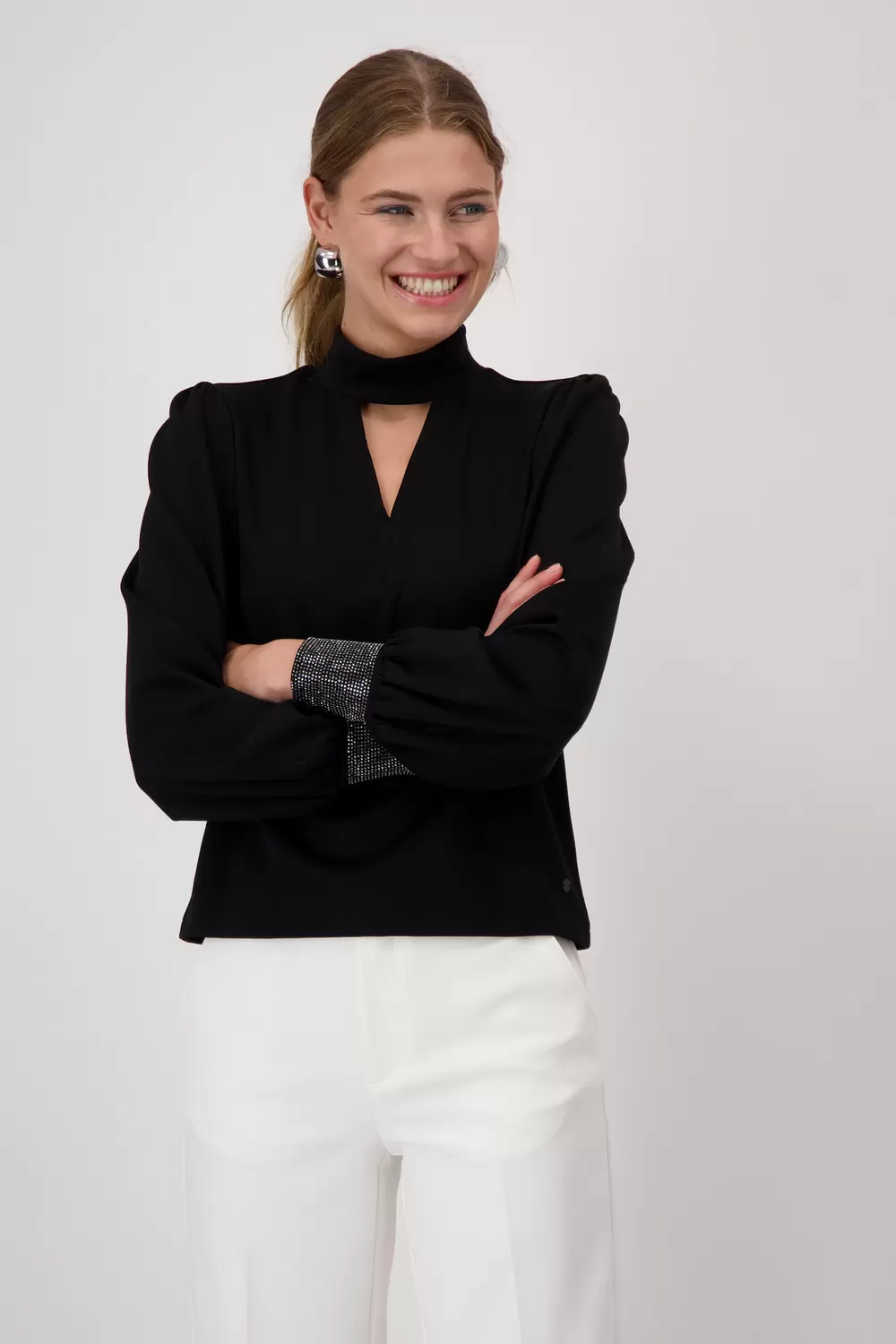 Dieses Shirt besticht durch seinen stilvollen Cut-out unter dem Stehkragen sowie durch breite Ärmelbündchen mit tonigem Strass und Kräuselung.