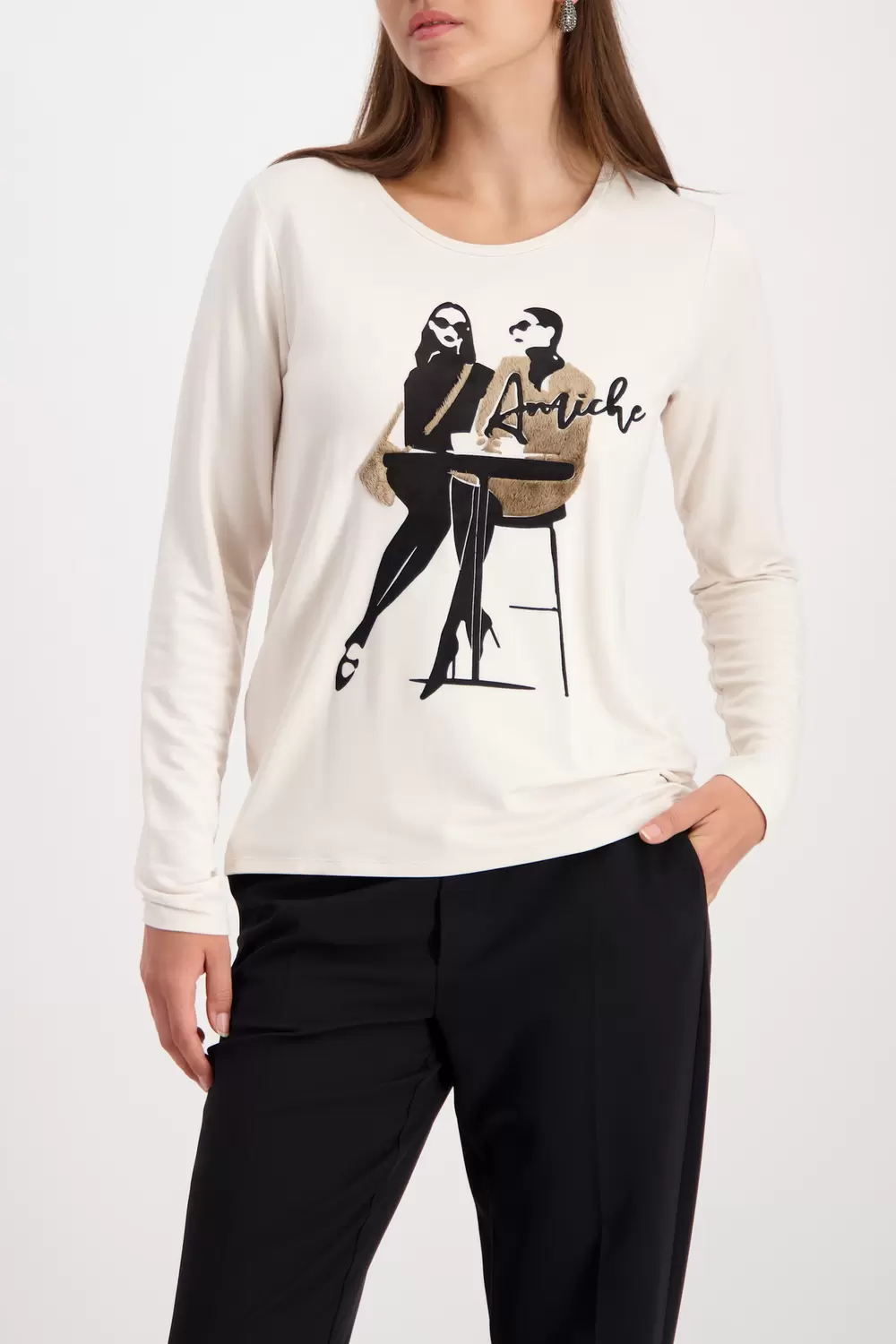 Dieses Langarmshirt verbindet sanfte Viskose mit Modal, attraktive Fellapplikationen und einen bezaubernden Frauen Druck.
