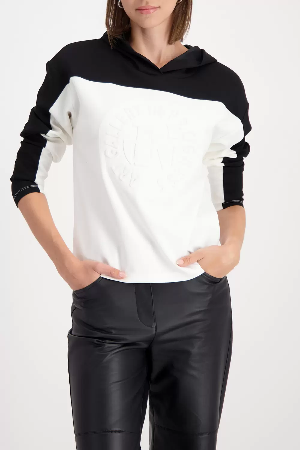 Dieses stilvolle Sweatshirt kombiniert eine fließende Viskose, einen Strass-Prägedruck und Colorblock mit einer lässigen Kapuze.