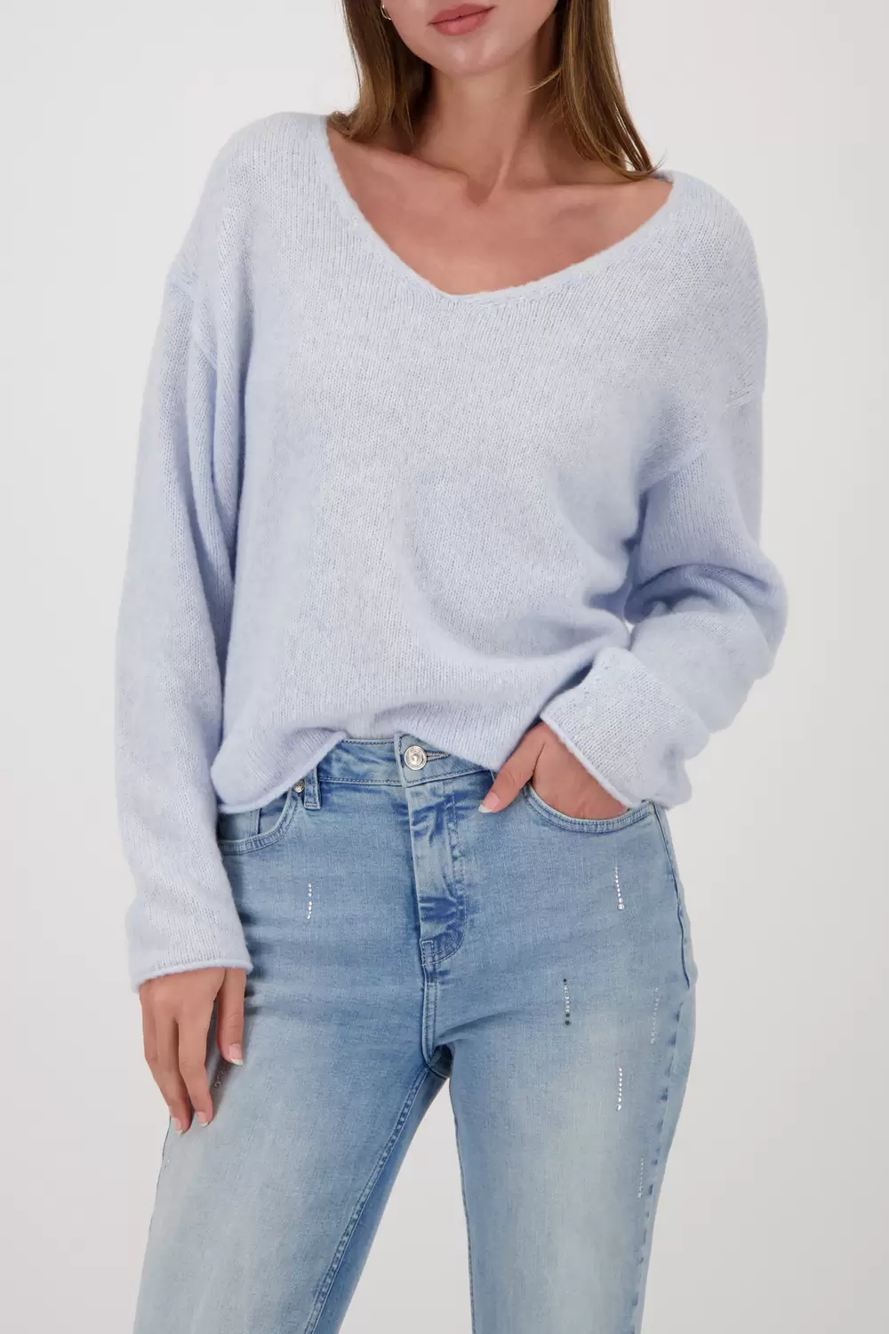 Erleben Sie den flauschigen Strickpullover aus einer hochwertigen Baumwolle mit V-Ausschnitt und eleganten Rollsäumen.